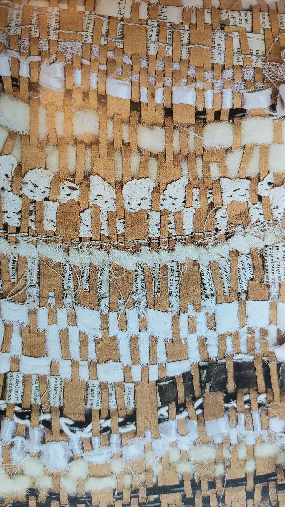 | More of the heavier cardboard packaging woven into with printed newspaper. This was then printed onto and hand stitched. By Shaun West. |